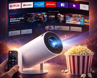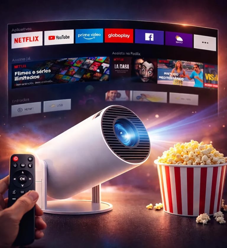 O Projetor Smart Portátil HY300 VLX entrega imagem nítida em Full HD com suporte a 4K, proporcionando cores vivas e excelente definição para filmes, séries, jogos e apresentações. Compacto e moderno na cor branca, ele combina perfeitamente com qualquer ambiente.